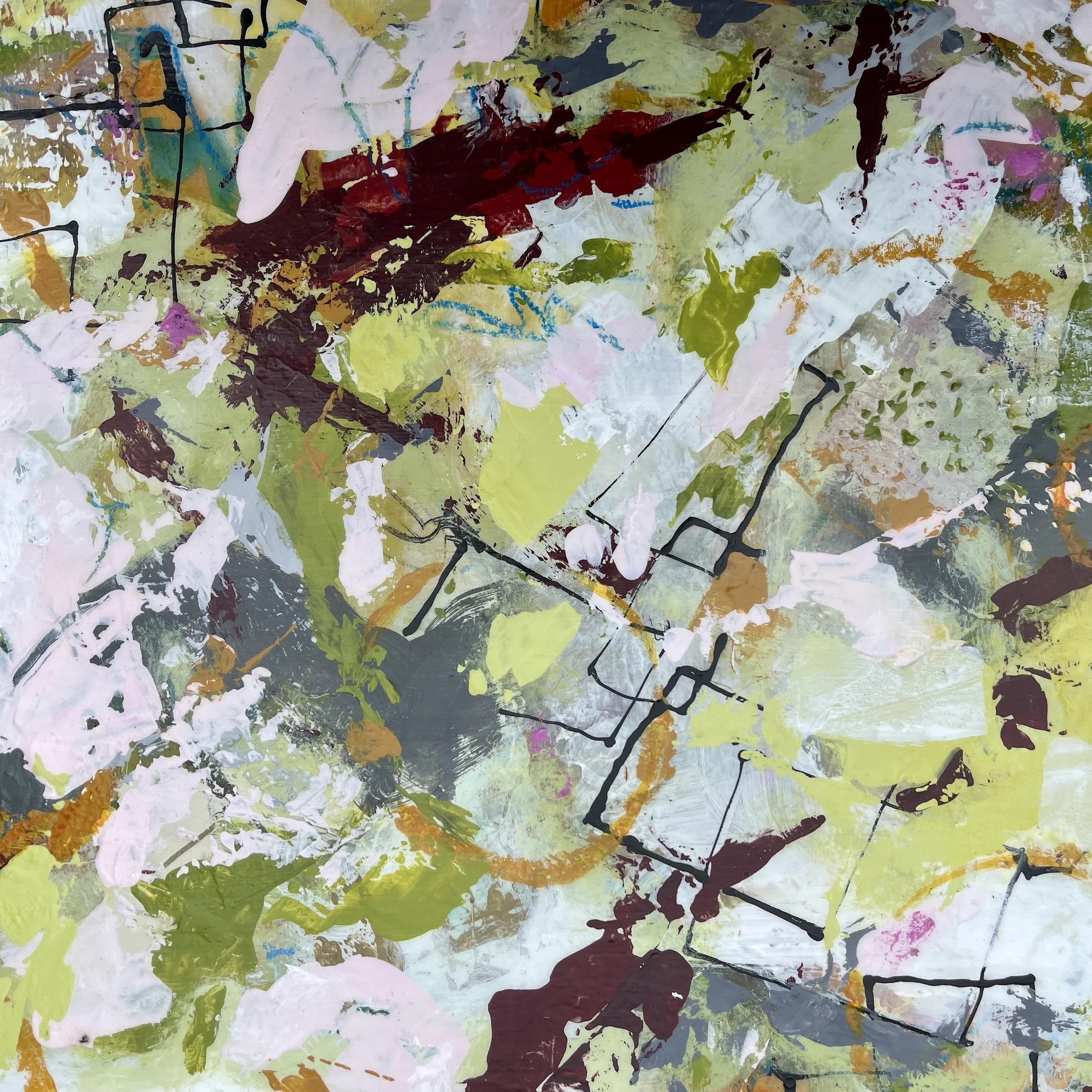 My works usually begin with color or a collage element, just begging me to play with it. The first mark always leads me on a journey, that continues as you experience and savor the work.