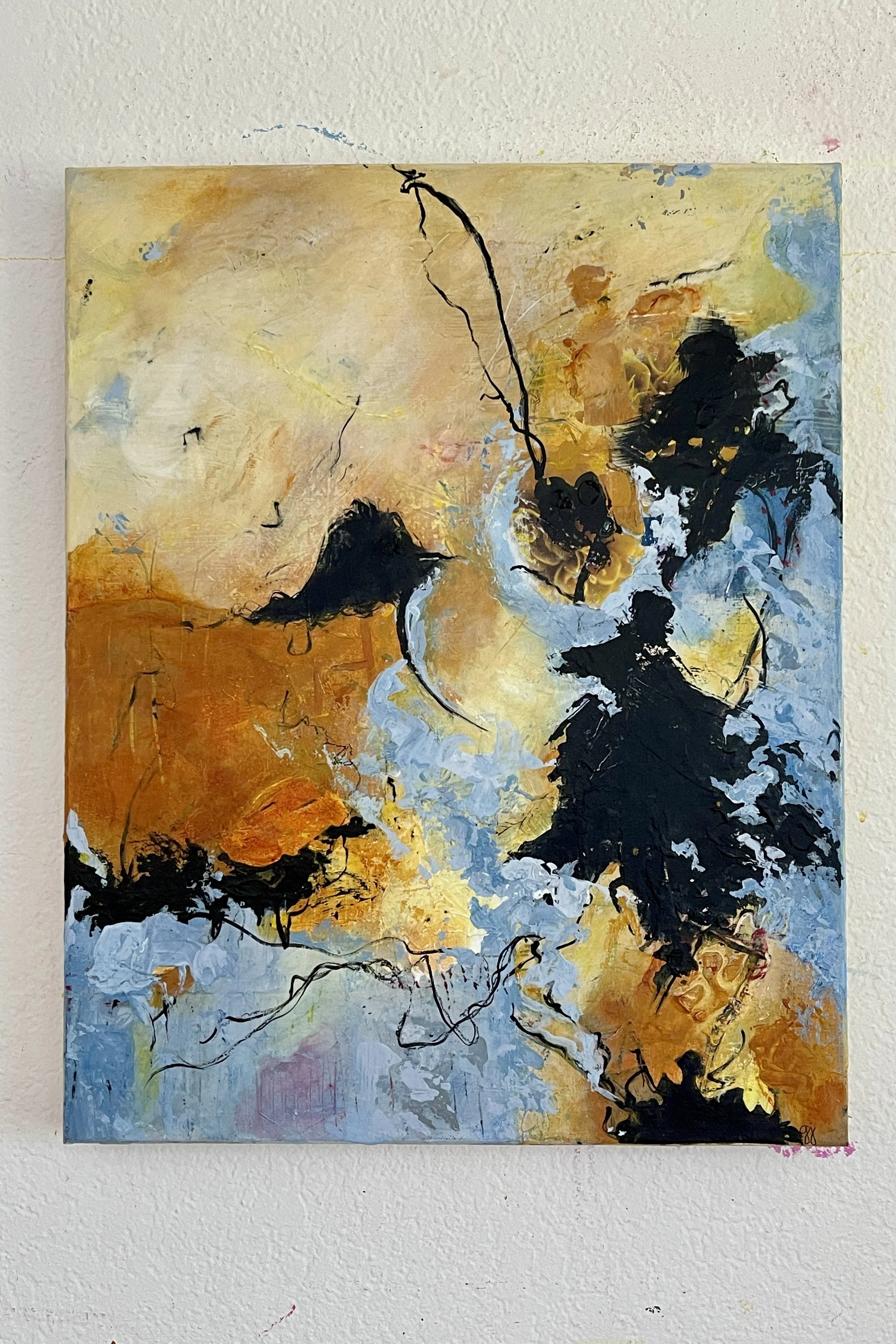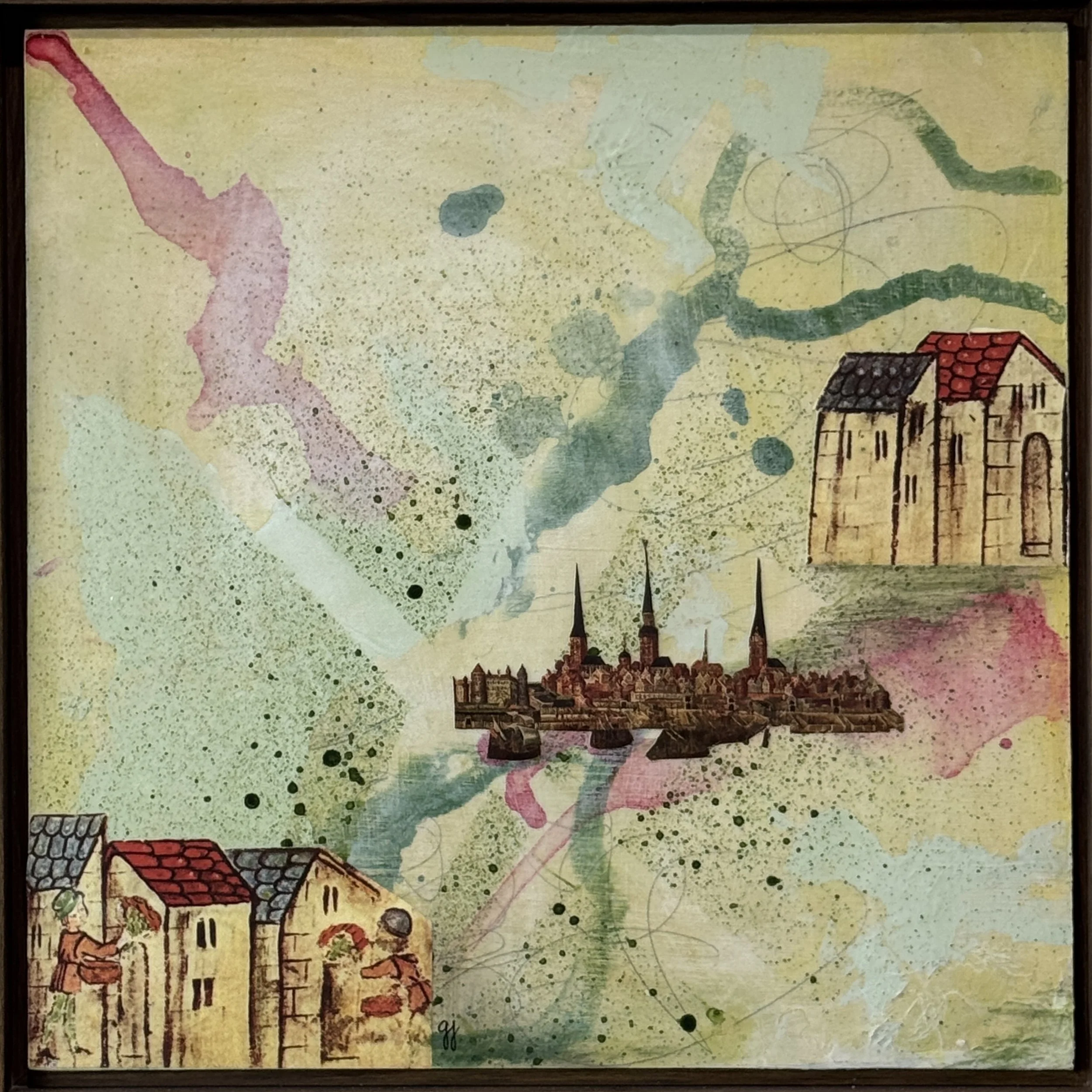 Town and Country a 12 × 12 inch piece, framed, on wood panel, I named it Town and Country because the dark sections at the bottom reminded me of a skyline and the born and green makes of fields, streams and the woods/